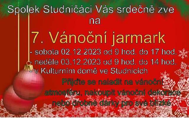 Obec Studnice Vás srdečně zve na 7.Vánoční jarmark, který se koná v termínu od 2. - 3. 12 2023 v Kulturním domě ve Studnicích. Přijďte se naladit na vánoční atmosféru, nakoupit vánoční dekorace nebo drobné dárky pro své blízké.